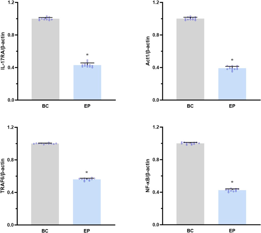 As shown in Figure 6, EPI significantly reduced the mRNA expression levels of IL-17RA, Act1, TRAF6, and NF-κB in the primary hepatocytes from T2DM-related MASH mice compared to those in the BC group in vitro (IL-17RA: approximately 0.43-fold, p < 0.001; Act1: 0.39-fold, p = 0.001; TRAF6: 0.56-fold, p = 0.014; NF-κB: 0.42-fold, p = 0.002).