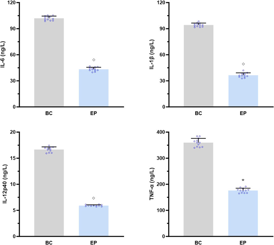 Figure 7. EPI inhibited the IL-17A-induced activation of IL-17RA/NF-κB signaling pathway in the primary hepatocytes of T2DM-related MASH mice in vitro. Data are presented as the mean ± SEM. *p < 0.05 vs. BC; ◇ p < 0.001 vs. BC. Abbreviations for treatment groups: BC, blank control; EP, epiberberine pre-treatment. Abbreviations for parameters: IL-6, interleukin 6; IL-1β, interleukin 1 beta; IL-12p40, interleukin 12p40; TNF-α, tumor necrosis factor alpha.