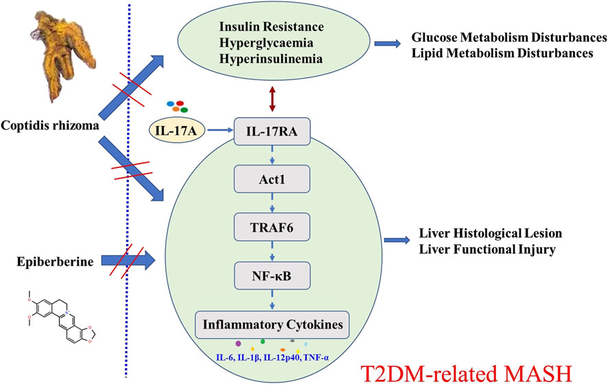 Our findings reveal, for the first time, that Coptidis rhizoma effectively ameliorates T2DM-related MASH by downregulating the IL-17RA/NF-κB signaling pathway at both the overall and cellular levels. Upon binding of IL-17A (secreted by Th17 cells) to its receptor IL-17RA, downstream signaling through Act1, TRAF6, and NF-κB is activated, leading to the transcription of pro-inflammatory cytokines and exacerbation of hepatic inflammation and injury (Beringer and Moissec, 2018). We demonstrated that Coptidis rhizoma treatment significantly reduced the expression of IL-17RA, Act1, TRAF6, and NF-κB in a dose-dependent manner, thereby attenuating the inflammatory responses and improving liver pathology. The therapeutic effects were observed across three clinically relevant dosages of Coptidis rhizoma, corresponding to the typical human daily dosage range of 4.5 g–18 g for adult T2DM patients (Pang et al., 2016). Among the active metabolites, EPI played a pivotal role in mediating these effects. Our in vitro studies further confirmed that EPI inhibited IL-17A-induced secretion of pro-inflammatory cytokines and downregulated the expression of key IL-17RA/NF-κB pathway components in the primary hepatocytes. A schematic diagram illustrating the mechanism of Coptidis rhizoma and EPI in ameliorating T2DM-related MASH is shown in Figure 8.