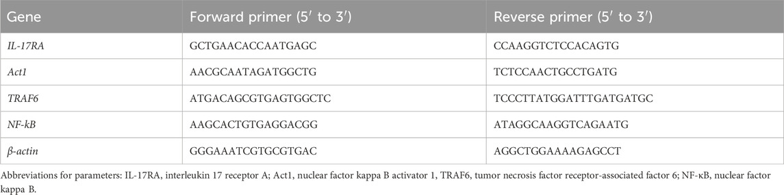 Total RNA was extracted using TRIzol reagent following the manufacturer’s instructions. The ratio of the absorbance at 260 nm and 280 nm (A260/280) was used to assess the purity of the RNA. The A260 was measured to determine the RNA concentration. cDNA was synthesized from 1 μg of total RNA using random primers. qPCR was performed using the Bio-Rad IQ5 system with SYBR Green Premix Ex Taq (Bio-Rad Laboratories, Inc., CA, United States), following the 2−ΔΔCt method (Ross et al., 2003). The thermal cycling program was as follows: 95 °C for 5 min, followed by 35 cycles of 95 °C for 10 s, 55 °C for 20 s, and 72 °C for 20 s. Melting curve analysis was used to confirm amplification specificity. The primer sequences are listed in Table 1. Each sample was run in duplicate. β-Actin was used as the internal control.