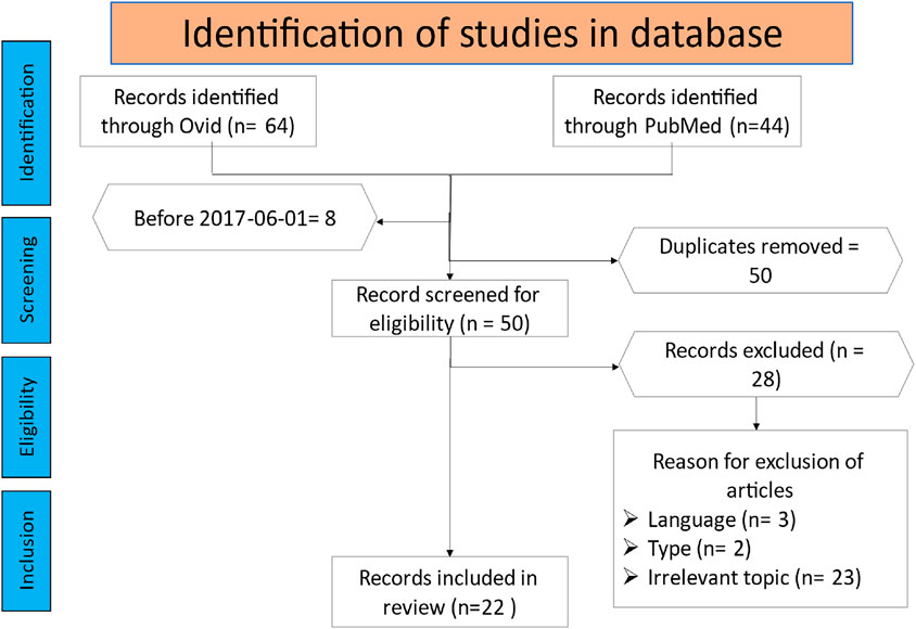 The literature search identified 108 potential publications. All articles before fifth of June 2017 were excluded. The two reviewers independently evaluated the titles and abstracts to determine their eligibility for inclusion in the scoping review. After the screening, 22 publications were deemed appropriate for further analysis and data extraction. The remaining papers were excluded for various reasons, such as lack of relevance to the role of the Wnt pathway in osteoporosis, language, or article type. Figure 1 provides an overview of the article selection process and the reasons for exclusion.