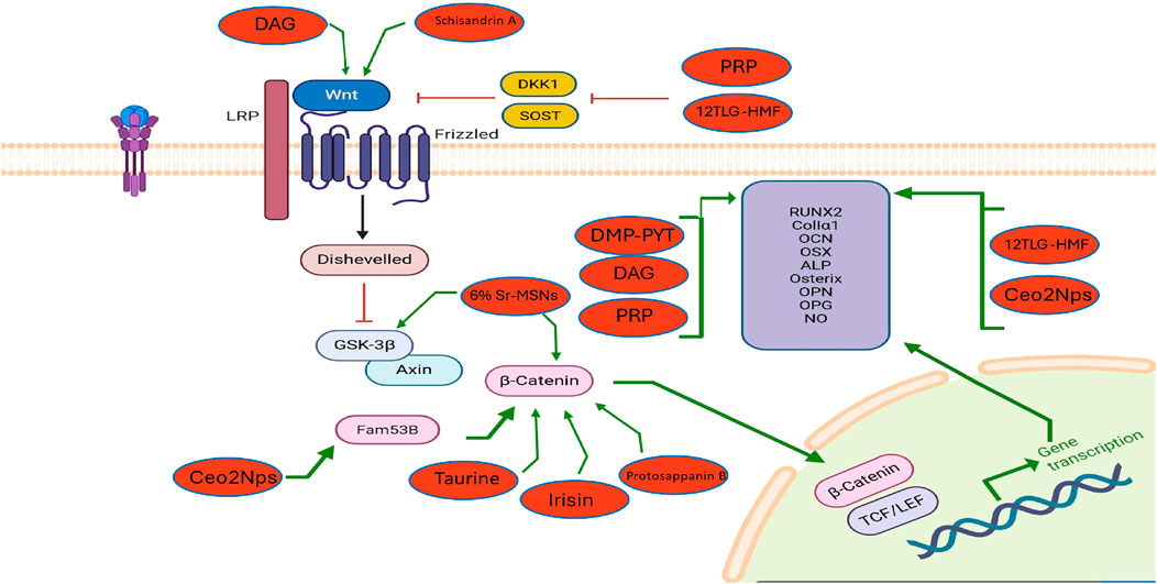 Biological derivatives also acted via Wnt signaling. Platelet-rich plasma (PRP) increased β-catenin and cyclin D1 expression and improved trabecular microarchitecture; inhibitor assays additionally revealed partial involvement of nuclear factor kappa-light-chain-enhancer of activated B cells/p38 (NF-κB/p38) signaling (Wang et al., 2018). Calcium hydroxide increased alkaline phosphatase (ALP) and OPN expression, although this effect appeared independent of Wnt activation (Cui et al., 2017).
