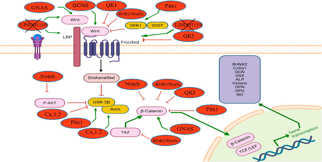 Several regulatory axes were found to converge on the Wnt pathway. Silencing of Long Intergenic Non-Protein Coding RNA 1119 (LINC01119) enhanced osteogenic differentiation of hBMSCs by increasing Wnt receptor expression (LRP5, β-catenin), an effect abrogated by co-silencing FZD4 (Gao et al., 2022). The RNA-binding protein Quaking (QKI) acted as a negative regulator by binding and destabilizing transcripts of dishevelled 3 (Dvl3), Fzd7, and β-catenin; its knockdown restored osteogenesis both in vitro and in vivo (Yan et al., 2023). Transgenic overexpression of Pitx1 suppressed osteogenic markers (Runx2, ALP, osterix, OCN), and increased Wnt inhibitors (Sost, Dkk1), whereas lithium chloride treatment rescued Wnt activity and bone formation (Karam et al., 2019). Similarly, knockdown of Guanine nucleotide binding protein subunit α (GNAS) suppressed Wnt3a and β-catenin and impaired osteogenesis, whereas overexpression restored these parameters (Zheng et al., 2020).