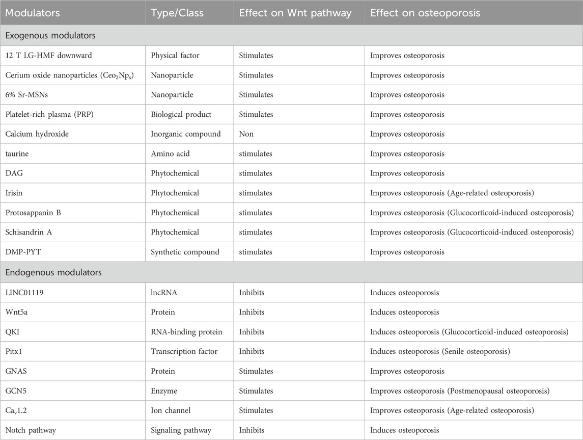 The canonical Wnt/β-catenin signaling pathway is central to skeletal biology, regulating osteoblast differentiation, bone matrix formation, and the suppression of osteoclast activity (Janssen et al., 2021). This review synthesizes current evidence on endogenous and exogenous modulators of the pathway, as well as clinical implications, highlighting its therapeutic potential for osteoporosis. Several modulators show promising clinical potential in osteoporosis management through stimulation of the Wnt signaling pathway. Agents such as CeO2NPs, DAG, taurine, irisin, protosappanin B, schisandrin A, and DMP-PYT have been reported to stimulate osteogenesis, supporting bone formation (Bae et al., 2017; Lou et al., 2018; Liu et al., 2019; Luo et al., 2023; Ai et al., 2025; Fan et al., 2025; Xing et al., 2025). Meanwhile, interventions like 12 T LG-HMF (magnetic stimulation), 6% Sr-MSNs, and platelet-rich plasma (PRP) not only promote osteoblast activity but also inhibit osteoclastogenesis (Wang et al., 2018; Liu et al., 2022; Zhang et al., 2023), thereby reducing bone resorption. Collectively, these modulators demonstrate how targeting the Wnt pathway can influence both bone formation and resorption, highlighting their translational potential in osteoporosis therapy.