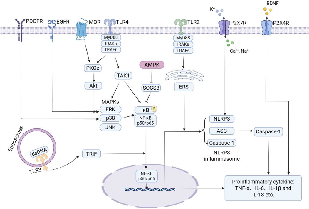 Figure 1. Schematic illustration of microglial signaling pathways associated with morphine tolerance. During the development of morphine tolerance, morphine activates key receptors on microglia, directly or indirectly, such as MOR, TLRs, P2XRs, and RTKs. This activation then triggers downstream signaling pathways, including MAPK, NF-κB, NLRP3, and AMPK. The activation of these pathways promotes the release of various pro-inflammatory mediators from microglia, thereby exacerbating neuroinflammation and contributing to the onset of morphine tolerance. Arrows indicate activation, and blunt-ended lines represent inhibition. PDGFR: platelet-derived growth factor receptor; EGFR: epidermal growth factor receptor; MOR: μ-opioid receptor; TLR: toll-like receptor; P2X7R: purinergic P2X7 receptor; P2X4R: purinergic P2X4 receptor; BDNF: brain-derived neurotrophic factor; MyD88: myeloid differentiation primary response 88; IRAKs: interleukin-1 receptor-associated kinases; TRAF6: TNF receptor-associated factor 6; PKCε: protein kinase C epsilon; Akt: protein kinase B; TAK1: transforming growth factor β-activated kinase 1; AMPK: AMP-activated protein kinase; SOCS3: suppressor of cytokine signaling 3; ERS: endoplasmic reticulum stress; MAPKs: mitogen-activated protein kinases; ERK: extracellular signal-regulated kinase; JNK: c-Jun N-terminal kinase; IκB: inhibitor of kappa B; NF-κB: nuclear factor kappa B; NLRP3: NOD-like receptor protein 3; ASC: apoptosis-associated speck-like protein containing a CARD; TRIF: TIR-domain containing adaptor inducing interferon-β; dsDNA: double-stranded DNA; TNF-α: tumor necrosis factor-α.