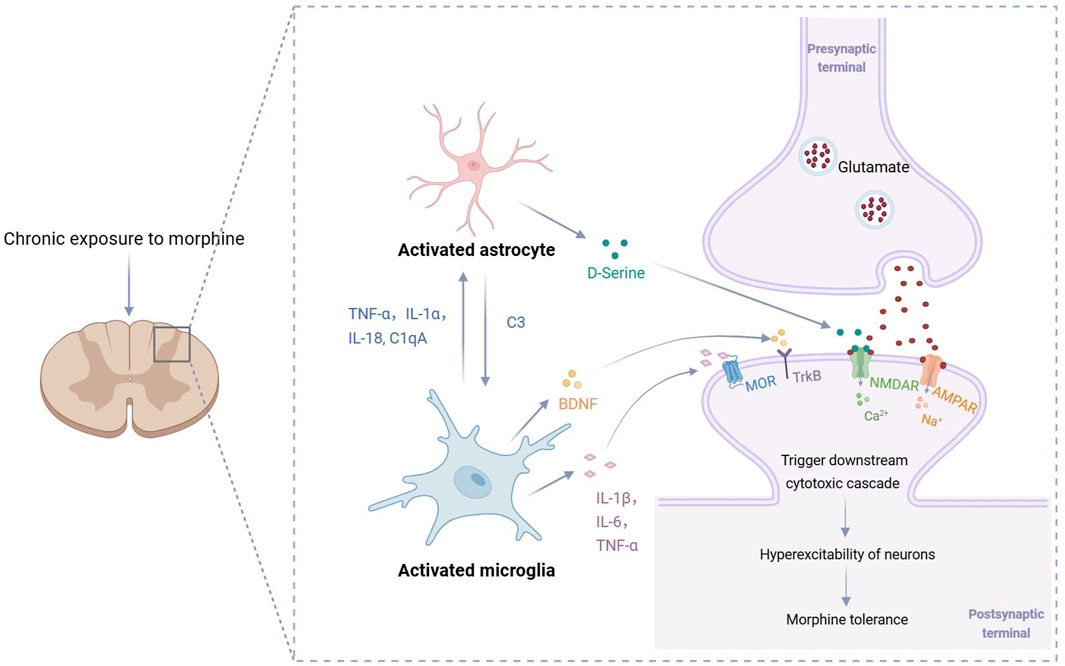 On one hand, prolonged morphine use activates microglia, prompting the release of pro-inflammatory cytokines such as TNF-α, IL-1α, IL-18, and complement C1q subcomponent subunit A (C1qA). These inflammatory mediators drive astrocytes to transition to a neurotoxic A1 phenotype. Complement C3 (C3) secreted by A1 astrocytes further activates microglia by binding to C3a receptors (C3aR), creating a positive feedback loop that exacerbates neuroinflammation (Peng et al., 2025). Meanwhile, D-serine released by activated astrocytes promotes morphine tolerance by activating N-methyl-D-aspartate receptor (NMDAR) on neurons and triggering the PKCγ signaling pathway (Chen et al., 2012).