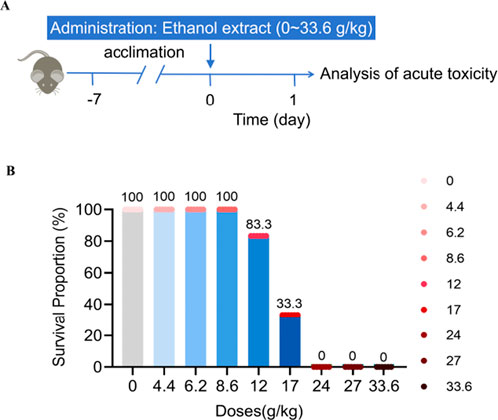 Figure 1. Acute toxicity evaluation of Emilia sonchifolia ethanol extract. (A) Experimental scheme determining the acute toxicity of Emilia sonchifolia ethanol extract in mice. (B) Effect of different doses of Emilia sonchifolia ethanol extract on mice survival (n = 6).
