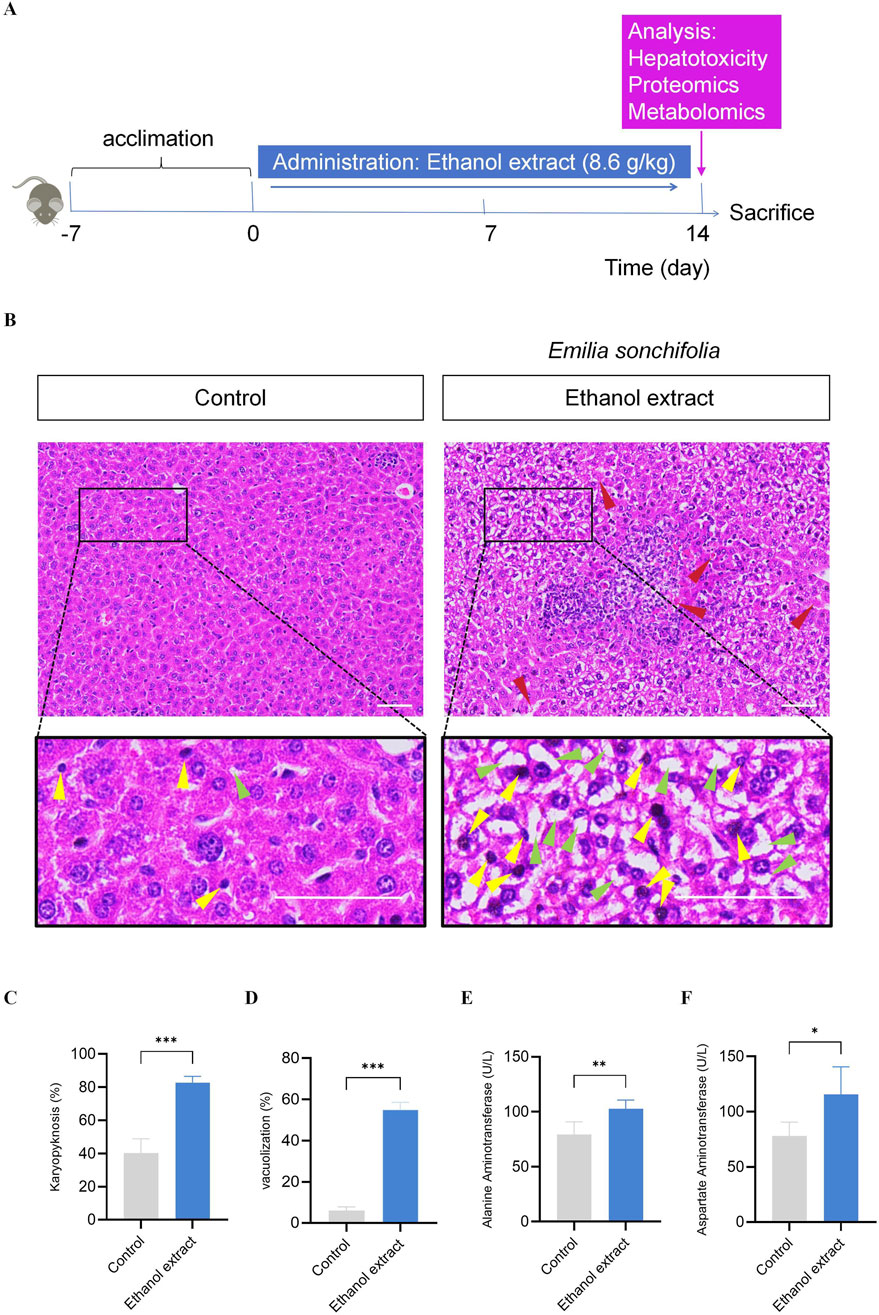 Emilia sonchifolia is a plant that possesses both medicinal and dietary applications (George and Kuttan, 2019; Jeeno et al., 2023). The PAs of E. sonchifolia are natural toxins, which can cause significant hepatomegalia, live venoocclusive disease, hepato-carcinogenicity, neurotoxicity, mutagenicity and embryotoxicity (Luo et al., 2019). Emilia sonchifolia is typically prepared using either water or ethanol extraction (An et al., 2025; Liu et al., 2025). Although our previous study has characterized the hepatotoxicity of the water extract of E. sonchifolia, the pathological mechanisms of its ethanol extract remain to be elucidated. In this study, we evaluated E. sonchifolia ethanol extract’s hepatotoxicity and investigated its mechanism by proteomics and metabolomics analysis. The results revealed that the hepatotoxicity induced by E. sonchifolia ethanol extract is associated with cholestasis and oxidative stress mediated under the co-regulation of phase I drug metabolism as a major pathway, phase Ⅱ drug metabolism, steroid hormone biosynthesis and primary bile acid biosynthesis as a minor pathway, which had some similarities with the mechanism of action of water extract. To the best of our knowledge, this study represents the first systematic investigation into the mechanism of hepatotoxicity induced by E. sonchifolia ethanol extract.