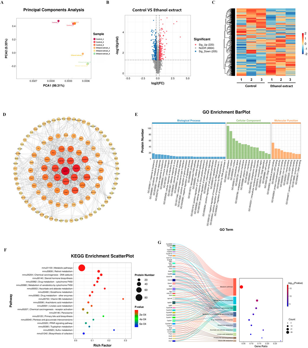 Figure 3. Proteomics analyses of liver tissue from mice treated with phosphate buffer saline or Emilia sonchifolia ethanol extract. (A) Principal components analysis to identify clusters of hepatic proteomes from mice treated with phosphate buffer saline or Emilia sonchifolia ethanol extract (n = 3). (B) Volcano plot of differentially expressed protein in the hepatic proteomics, in which the Bonferroni-adjusted -log10 (probability) is plotted against log2 (fold change). Significantly upregulated proteins are shown as red dots; significantly downregulated proteins, as blue dots. (C) Hierarchical cluster analysis of differentially expressed proteins between the liver tissues from control mice and mice treated with Emilia sonchifolia ethanol extract. (D) The protein-protein interaction (PPI) network was constructed using STRING (http://www.string-db.org) and Cytoscape software. Nodes represent proteins, while edges indicate interactions. The size and color of each node indicate the degree of connectivity, with larger and darker nodes representing higher degrees of interaction. (E) The GO enrichment Barplot for differentially expressed proteins in hepatic proteomics. The x-axis represents GO terms, while the y-axis indicates the number of proteins. Blue bars correspond to biological processes, green bars to cellular components, and orange bars to molecular functions. (F) The KEGG enrichment analysis of differentially expressed proteins in liver tissues from control mice and mice treated with Emilia sonchifolia ethanol extract. (G) The Sankey diagram illustrates the association between differentially expressed proteins (left) and KEGG pathways (right) identified in the hepatic proteomics analysis.
