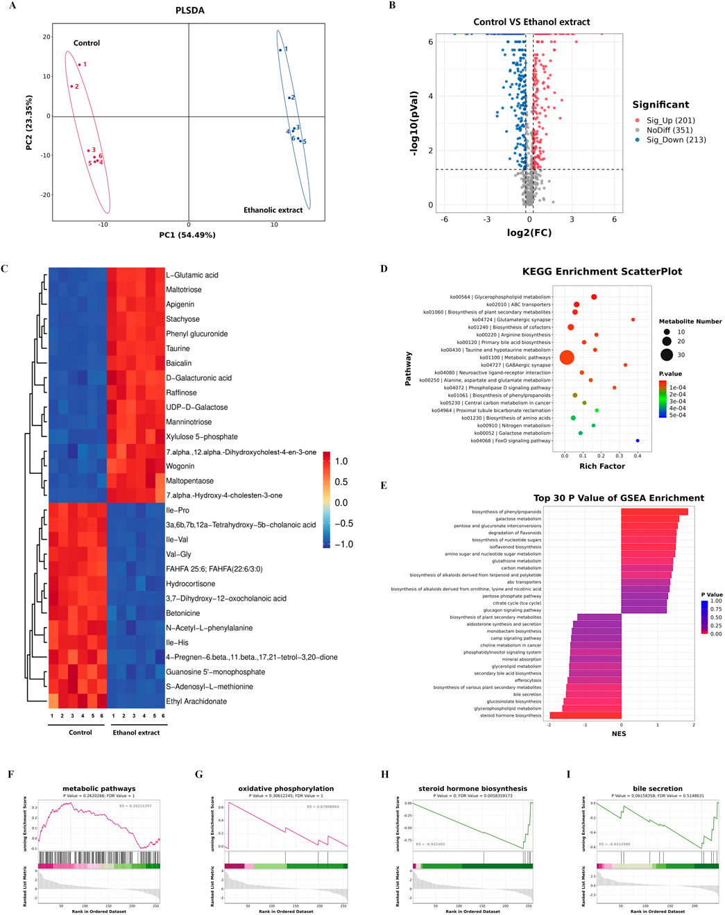 Figure 4. Metabolomics analyses of liver tissue from mice treated with phosphate buffer saline or Emilia sonchifolia ethanol extract. (A) Partial least squares discriminant analysis to identify clusters of hepatic metabolomes from mice treated with phosphate buffer saline or Emilia sonchifolia ethanol extract (n = 3). (B) Volcano plot of differentially expressed metabolites in the hepatic proteomics, in which the Bonferroni-adjusted -log10 (probability) is plotted against log2 (fold change). Significantly upregulated metabolites are shown as red dots; significantly downregulated metabolites, as blue dots. (C) Hierarchical cluster analysis of the top 30 differentially expressed metabolites between the liver tissues from control mice and mice treated with Emilia sonchifolia ethanol extract. (D) The KEGG enrichment analysis of differentially expressed metabolites in liver tissues from control mice and mice treated with Emilia sonchifolia ethanol extract. (E) Gene set enrichment analysis of differential metabolites between the liver tissues from control mice and treated with Emilia sonchifolia ethanol extract. (F–I) Gene set enrichment analysis, indicating enrichment of processes related to response to metabolic pathways (F), oxidative phosphorylation (G), steroid hormone biosynthesis (H) and bile secretion (I) in the metabolomes of liver tissues from mice treated with Emilia sonchifolia ethanol extract compared to the control mice.