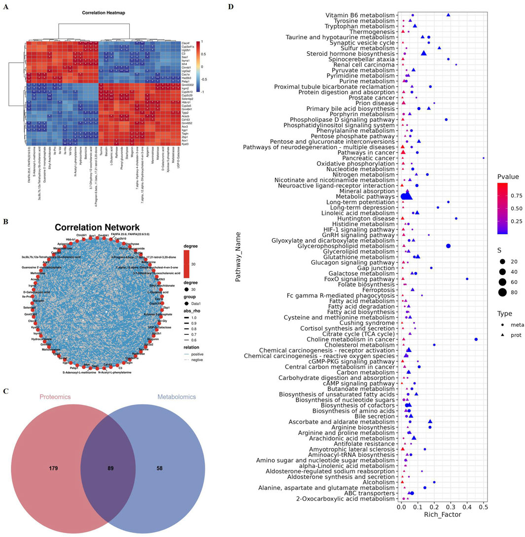 Next, we conducted an integrated analysis of proteomics and metabolomics. There is a significant correlation among these proteins and metabolites (Figures 5A,B). Correlation clustering heat map and network map revealed that the expression of the protein Cyp2c29 was upregulated, while Ugt2b1, Cyp3a41a, and Hsd3b3 were downregulated. These proteins are closely associated with pathways such as drug metabolism and steroid hormone biosynthesis (Sunoqrot et al., 2024). Additionally, the metabolites taurine, 7α,12α-dihydroxycholest-4-en-3-one, and 7α-hydroxy-4-cholesten-3-one were significantly upregulated, which are closely linked to primary bile acid biosynthesis (Luo et al., 2024; Yin et al., 2024). The Venn diagram indicated that 89 pathways were commonly enriched in both the proteomics and metabolomics analyses (Figure 5C). The significantly enriched pathways included metabolic pathways, steroid hormone biosynthesis, and primary bile acid biosynthesis (Figure 5D).