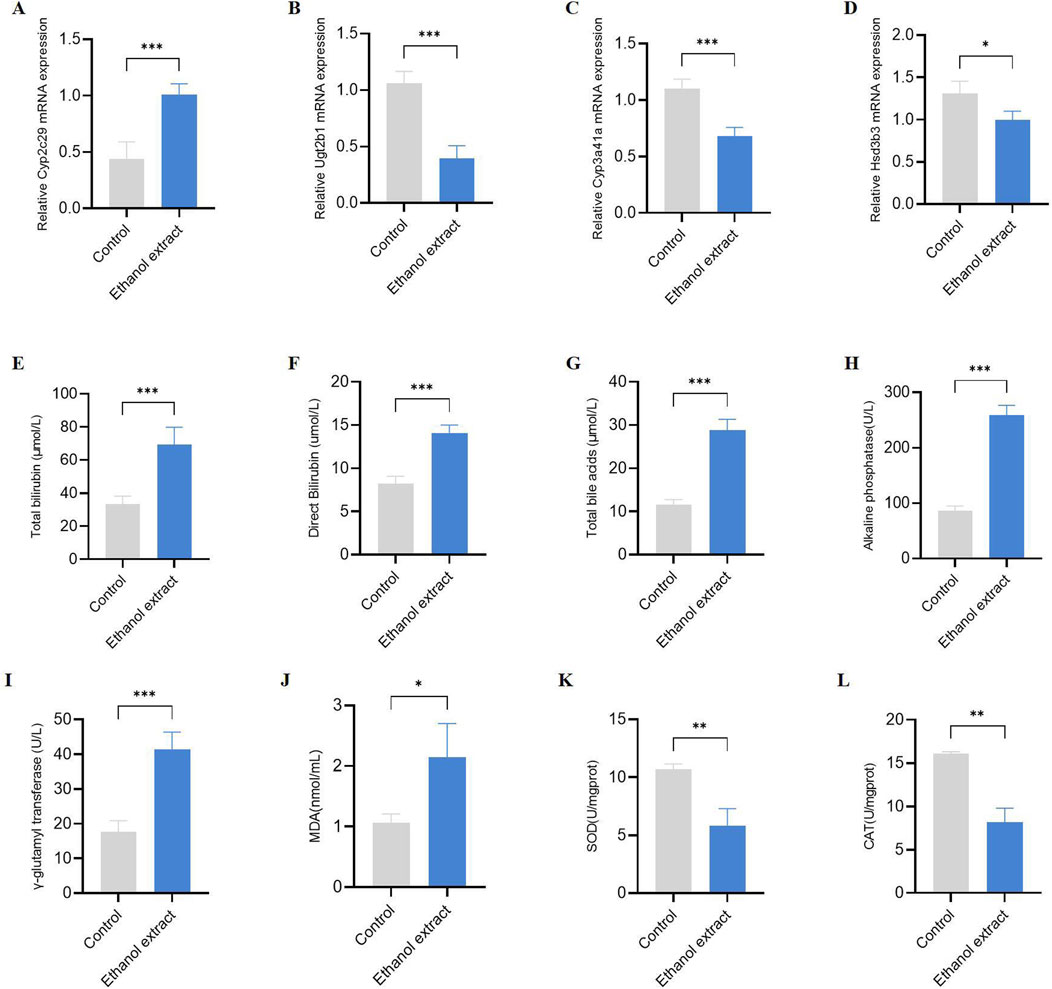 Taken together, we hypothesized that the hepatotoxicity induced by E. sonchifolia ethanol extract is associated with cholestasis and oxidative stress mediated by Cyp2c29, Cyp3a41a, Ugt2b1 and Hsd3b3. We have validated the above hypothesis, and the results show that in mice treated with E. sonchifolia ethanol extract, the gene expression level of Cyp2c29 was upregulated, while the expression levels of Ugt2b1, Cyp3a41a and Hsd3b3 were downregulated (Figures 6A–D). Meanwhile, compared to the control group, mice treated with E. sonchifolia ethanol extract exhibited significantly elevated serum levels of total bilirubin, direct bilirubin, total bile acids, alkaline phosphatase, and γ-glutamyl transpeptidase (Figures 6E–I). Furthermore, in the livers of mice treated with E. sonchifolia ethanol extract, the malondialdehyde level was increased, whereas the levels of superoxide dismutase and catalase were significantly decreased (Figures 6J–L).