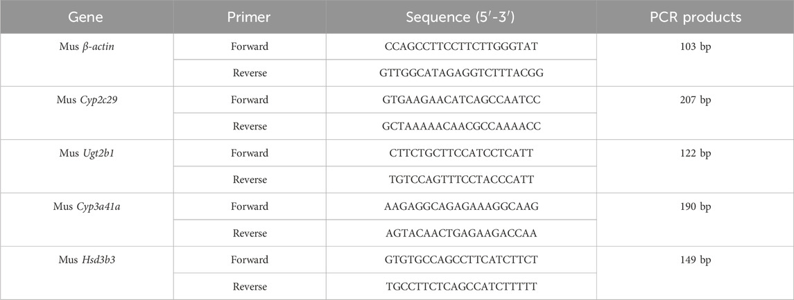 Quantitative RT-PCR was used to detect the mRNA expression levels of Cyp2c29, Cyp3a41a, Ugt2b1, and Hsd3b3 in mouse liver tissue. Total RNA was extracted from mouse liver tissue using tissue lysis and centrifugation methods. The reverse transcription reaction was performed in two steps: RT1 for the removal of genomic DNA, and RT2 for the preparation of the reverse transcription reaction mixture. The reaction conditions were as follows: initial denaturation at 95 °C for 10 min (1 cycle); denaturation at 95 °C for 15 s (40 cycles); annealing and extension at 60 °C for 60 s (40 cycles); melt curve collection at 95 °C for 15 s, 60 °C for 60 s, and 95 °C for 15 s (1 cycle). The qRT-PCR primer sequences are listed in Table 1, and all primers were synthesized by Beijing Tsingke Biotech Co., Ltd. (Beijing, China). Each containing three replicates for all genes and the relative fold changes were calculated using the 2−ΔΔCT method.
