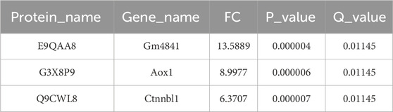 Liver tissue samples were collected and immediately frozen in liquid nitrogen for proteomic analysis. TMT-based quantitative proteomics analyses were implemented as Zhang described (Zhang et al., 2023). Three biological replicates were prepared for ethanol extract control group for proteomics analysis. The specific operations will be carried out by LC-BIO Technologies Co., Ltd. (Hangzhou, Zhejiang, China). Detailed protein extraction, purification, peptide tagging and reverse-phase chromatography and mass spectrometry were referred to previous report (Zhang et al., 2023). Protein identification, quantification, classification and interaction prediction were analyzed (Liu et al., 2022). The raw files generated by AQ Exactive Plus were converted using Proteome Discoverer 2.1 (Thermo Fisher Scientific), and the files were sent to OmicStudio tools for analysis (Kolli et al., 2023). Differentially expressed proteins were defined as those with a fold change ≥1.2 or ≤1/1.2 -fold and a P-value<0.05. Protein-protein interaction was further analyzed by string (http://www.string-db.org) and the core genes were screened by cytoscape software. The differentially expressed proteins were functionally classified by Gene Ontology (GO) terms (http://www.omicsbean.com). The Kyoto Encyclopedia of Genes and Genomes (KEGG) pathway of altered proteins was categorized utilizing the same resource.