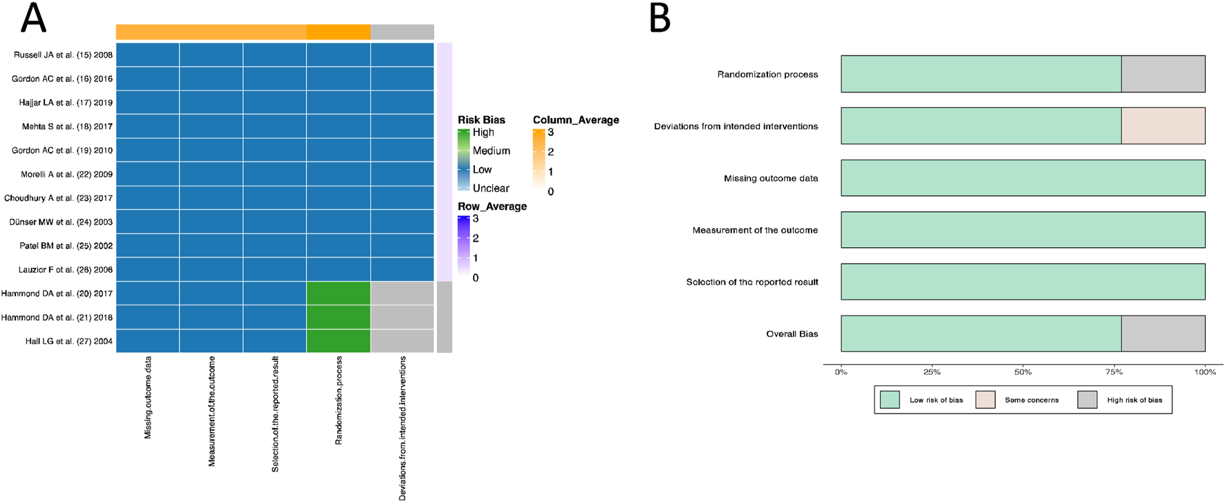 Quality evaluation and bias assessment based on Cochrane Risk of Bias V2.0. (A) Heatmap. (B) Histogram.