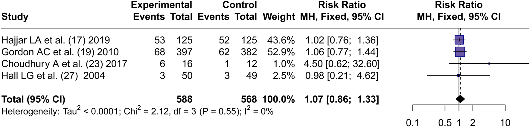 Four articles (Hajjar et al., 2019; Gordon et al., 2010; Choudhury et al., 2017; Hall et al., 2004) reported the incidence of AKI. By using a fixed effects model, the RR values of four articles were pooled. No significant difference in the incidence of AKI between AVP and NE in septic shock was found (RR = 1.07, 95% CI [0.86; 1.33], P = 0.53) (Figure 3).