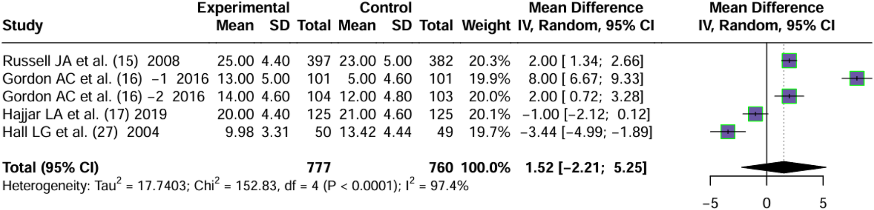 Four articles (Russell et al., 2008; Gordon et al., 2016; Hajjar et al., 2019; Hall et al., 2004) reported on days free of renal failure. Significant heterogeneity was observed between the trials (I2 = 97.4%, P < 0.0001). By using a random effects model, the MD values of four articles were pooled. No significant difference in the days free of renal failure of patients treated with vasopressin and norepinephrine in septic shock was observed (MD = 1.52, 95% CI [−2.21; 5.25], P = 0.43) (Figure 4).