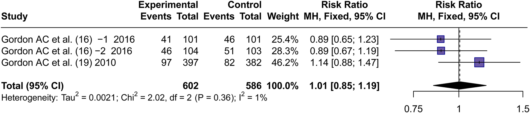 Two articles (Gordon et al., 2016; Gordon et al., 2010) reported the incidence of Renal failure. By using a fixed effects model, the RR values were pooled. No significant difference in the incidence of RF between AVP and NE was observed (RR = 1.01, 95% CI [0.85; 1.19], P = 0.94) (Figure 5).