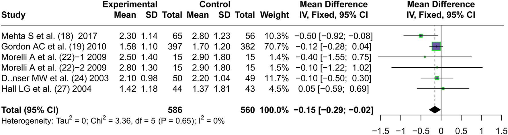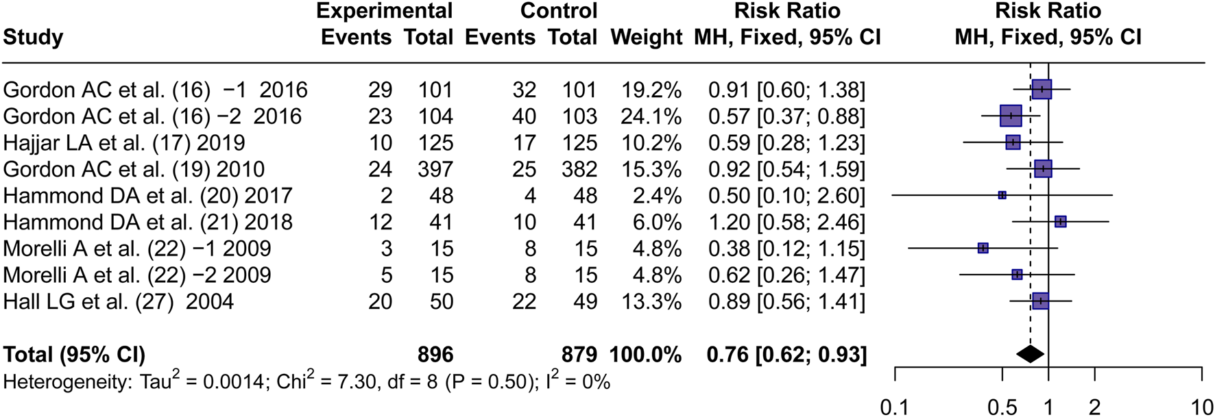 Seven articles (Gordon et al., 2016; Hajjar et al., 2019; Gordon et al., 2010; Hammond et al., 2019; Hammond et al., 2018; Morelli et al., 2009; Hall et al., 2004) reported RRT use rate. By using a fixed effects model, the RR values of 7 articles were pooled. It was found that there was a significant difference in RRT-use rate between AVP and NE groups (RR = 0.76, 95% CI [0.62; 0.93], P < 0.01) (Figure 6). This corresponds to an approximate absolute risk reduction of 5%–10%, suggesting a potentially meaningful clinical effect.