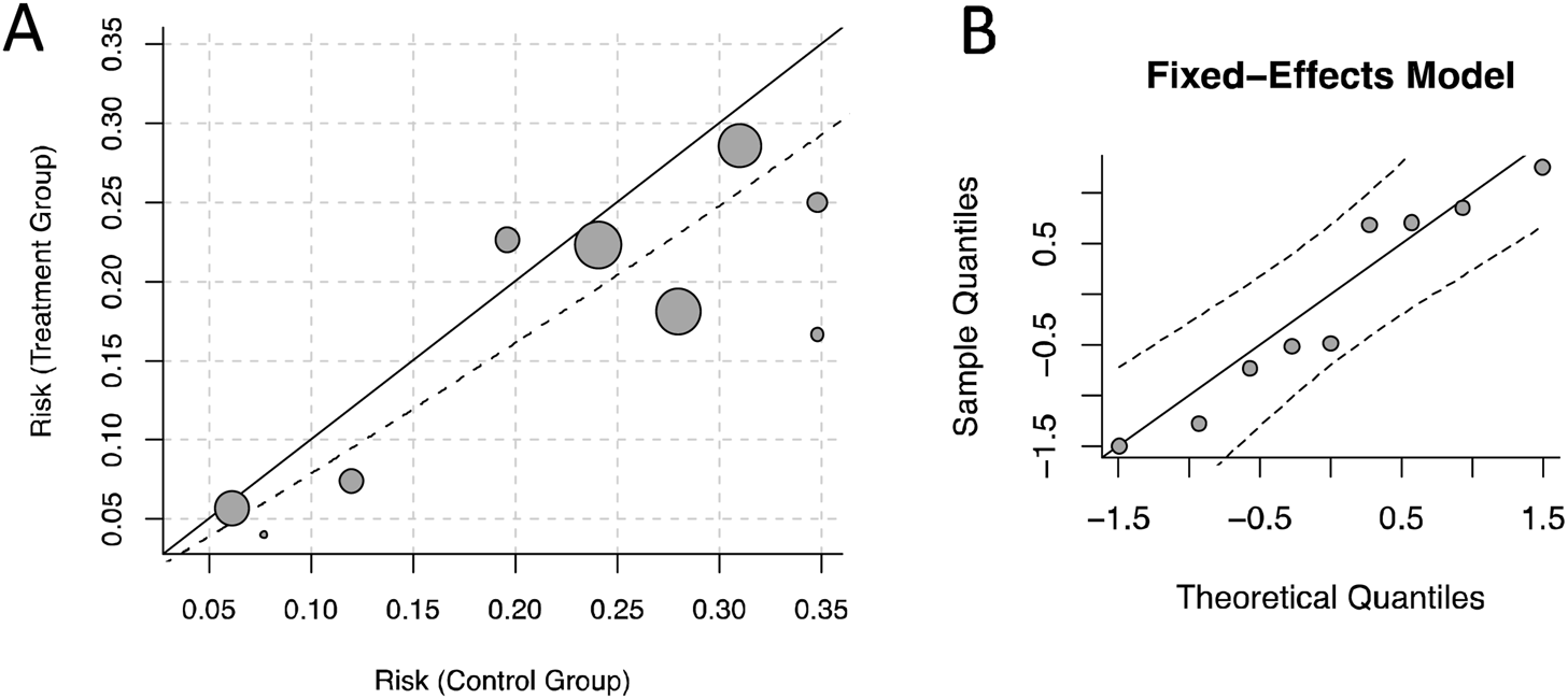 The “Labbe” function provided by the “metafor” package was used to plot a L'Abbé plot (L'Abbé et al., 1987), and the “qqnorm” function was used to plot a normal quantile-quantile (QQ) plots (Shi et al., 2017) to demonstrate the concentration of literature.