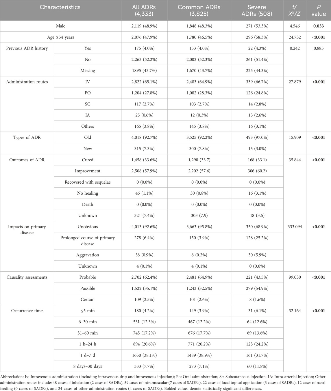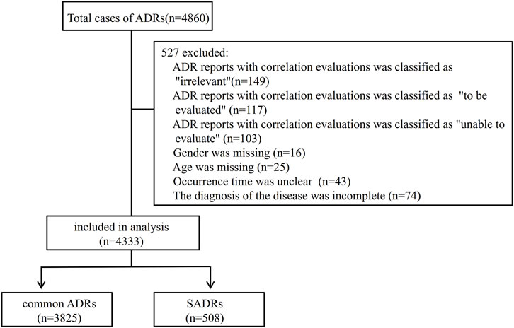 In accordance with ICH E2A guidelines (Therapeutic Goods Administration of Department of Health of Australian Government, 2000), SADRs are defined as any event meeting at least one of the following standards: (i) Requires inpatient hospitalization or prolongation of hospitalization; (ii) Results in persistent or significant disability/incapacity; (iii) A congenital anomaly/birth defect; (iv) Life-threatening; (v) Fatal outcome; (vi) Other serious medical events that may lead to the aforementioned outcomes (Chen et al., 2018).