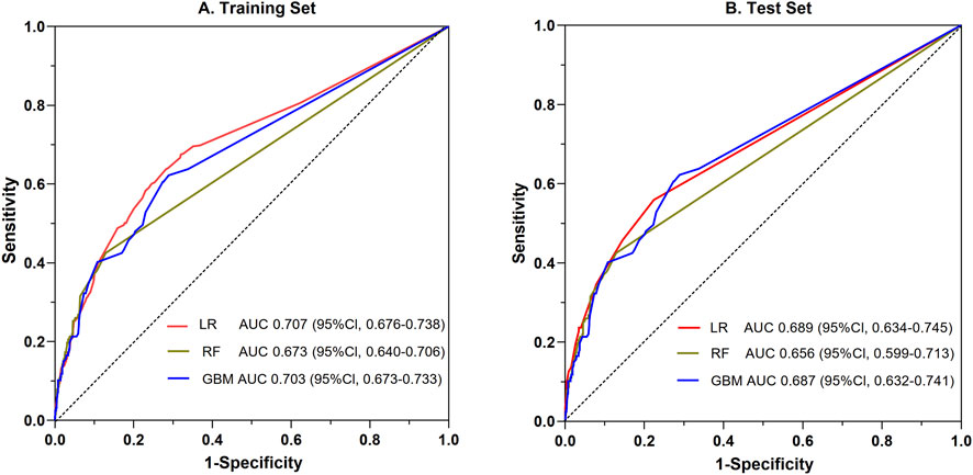 Utilizing the 20 variables selected (Figure 2), we employed three ML algorithms to construct an prediction model for SADRs. Following rigorous nested hyperparameter tuning, the possibility that the observed superiority arose from overfitting or stochastic parameter selection was effectively ruled out. As revealed in Figure 3A, AUC values of the LR, RF and GBM models were 0.707, 0.673, and 0.703 respectively based on the training set. Among the three models, LR showed the highest level of predictive accuracy (AUC = 0.707, 95% CI 0.676–0.738). The results of the test set were similar to the training sets (Figure 3B). The additional performance metrics of each model, including specificity, accuracy, sensitivity, F1-score and precision, are detailed in Supplementary File 2; Supplementary Tables S8, S9.