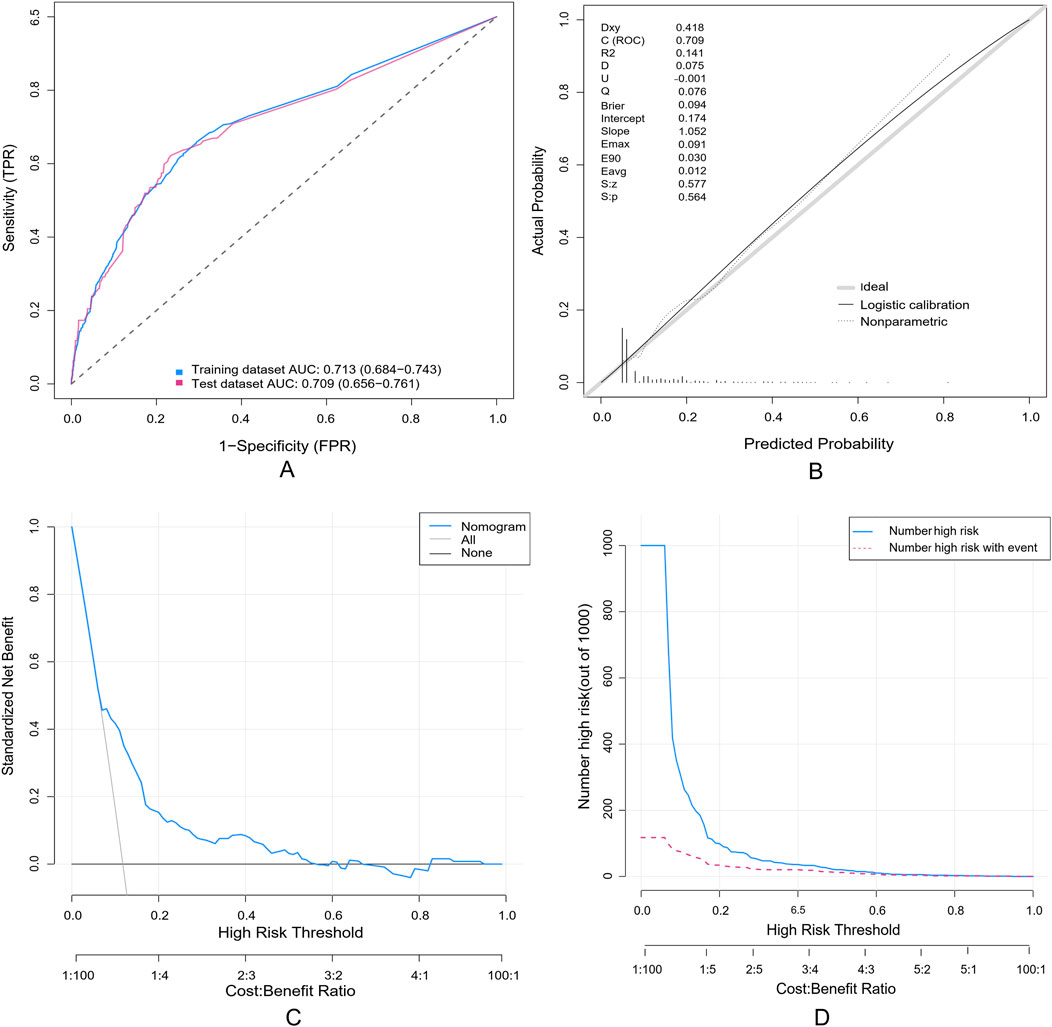 Figure 5. Evaluation of a nomogram model for predicting SADRs. (A) Receiver Operating Characteristic curve (ROC) of the training set and the test set. The area under the curve (AUC) of the purposed nomogram for predicting SADR in the training set and in the test set was 0.713 and 0.709, respectively. (B) The calilbration of the nomogram. The Calibration curve analysis of the nomogram in the test set. (C) The DCA of the nomogram for predicting SADR in the test set. The DCA curve of the nomogram. it was revealed that SADR prediction using the nomogram isaccompanied with a higher net benefit than using any single factor alone, as wel as by treating either no or all patients. (D) The CIC curve of the purposed nomogram in the test set. The red curve (the number of individuals at high risk) indicates the number of persons who are classified as positive (high risk) by the prediction model at each threshold probability; the blue curve (the number of individuals at high risk with outcomes) is the number of true positives at each threshold probability.