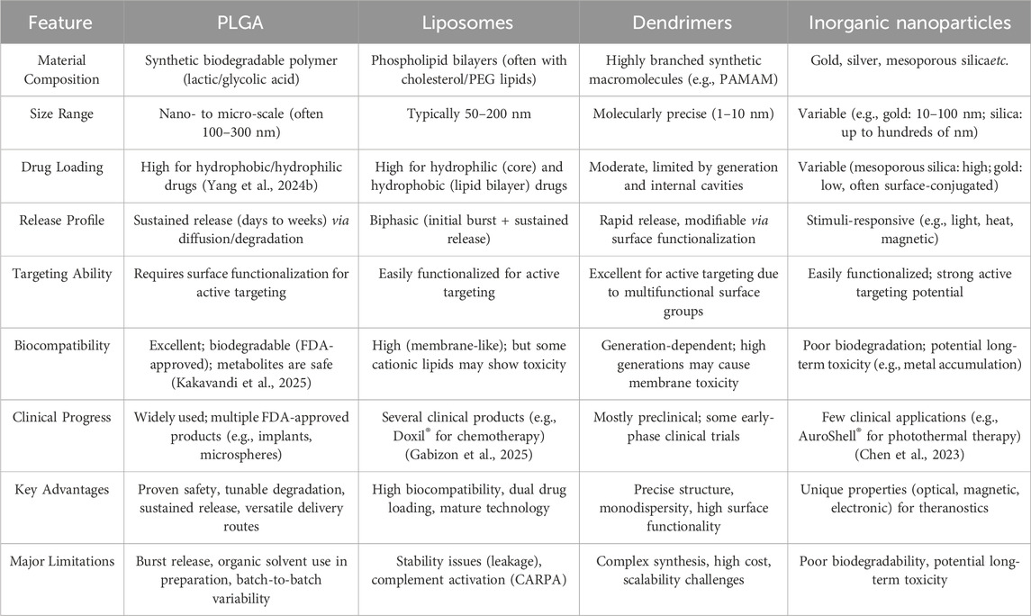 The efficacy of a drug is not only related to pharmacokinetics, but more importantly depends on its bioavailability at the intended site of action, which in turn is determined by the drug delivery method (Agnihotri et al., 2004; Allen and Cullis, 2004; Alavi et al., 2024). Medical nanotechnology is an emerging multifunctional platform, which may greatly affect the delivery of multiple therapeutic drugs, including small molecule chemicals, peptides, genes and diagnostic imaging agents (Farokhzad and Langer, 2006; Shi et al., 2016; Li et al., 2021). Nanostructure based carriers can change the treatment mode of diseases through drug delivery controlled by time and space. These therapeutic agents are encapsulated in the nanocarrier or covalently grafted on the surface of the nanocarrier. After intravenous injection, Their release is affected by carrier composition, pH of microenvironment, temperature, external regulation and other factors (Kamaly et al., 2012; Kamaly et al., 2016; Zheng et al., 2017; Yang et al., 2024a). A diverse array of materials encompassing synthetic polymers (e.g., PLGA and polyamides), natural polymers (including hyaluronic acid, chitosan, and albumin), phospholipids, along with inorganic substrates (gold, copper, silver, and zinc) have been extensively employed in the fabrication of nanocarriers (Dykman and Khlebtsov, 2016; Lee et al., 2016; Hong and Choi, 2017; Lee et al., 2017; Oberli et al., 2017; De Matteis et al., 2018; Lee and Cho, 2018; Koo et al., 2019; Beach et al., 2024). Among these different materials, PLGA is the most promising material and the preferred material for preparing drug delivery nanoparticles (Danhier et al., 2012; Martins et al., 2017; Swider et al., 2018). Table 1 presents a comparative analysis of PLGA and other nanocarriers for drug delivery. PLGA has a long history in medicine as a biodegradable suture material. PLGA can be degraded into lactic acid (LA) and Glycolic acid (GA), thus entering the metabolic pathway, and finally into water and carbon dioxide. The U.S. Food and Drug Administration (FDA) has granted regulatory approval for PLGA as a matrix material in parenteral dosage forms, solidifying its status as a pharmaceutically validated excipient for injectable formulations (Mir et al., 2017). Surface chemical modification of PLGA nanoparticles can confer biological targeting functionality and prolong their systemic circulation time. Pharmaceuticals, peptides, and nucleic acids with distinct physicochemical properties can be either encapsulated within the PLGA nanoparticle core or adsorbed onto their outer surface. Furthermore, imaging agents may be incorporated into PLGA nanoparticles to endow them with diagnostic imaging capabilities for precise localization of pathological lesions (Danhier et al., 2010; Ratzinger et al., 2010; Acharya and Sahoo, 2011; Maeda et al., 2013; Sah et al., 2013; Nottelet et al., 2015; Peres et al., 2017; Hamdallah et al., 2024). The historical progression of PLGA-based nanosystems represents a remarkable evolution in drug delivery technology. Research on biodegradable polymers for drug delivery has been ongoing since they were first used as bioresorbable surgical devices in the 1980s. The progression from conventional drug delivery to multifunctional diagnostic-therapeutic applications represents a significant advancement in PLGA nanotechnology. Recent developments have demonstrated innovative approaches such as the anti-VEGFR2 antibody-coated PLGA nanoparticles for ocular delivery combine photothermal and chemotherapy to treat corneal neovascularization, and PLGA-PEG nanoparticles encapsulating DOX, SPIONs exhibit superior cytotoxicity, reduced cardiotoxicity, dual-mode MRI-fluorescence imaging (Salmasi et al., 2024; Ye et al., 2024). These advancements highlight the evolution of PLGA nanosystems from simple drug carriers to sophisticated theranostic platforms that combine targeted therapy with diagnostic capabilities. The simplicity and reliability of the PLGA nanoparticles fabrication techniques, coupled with their excellent biocompatibility, have significantly enhanced the feasibility of PLGA-based nanoparticles in clinical applications. This paper elucidates the fundamental principles of employing PLGA as a drug delivery vehicle, outlines fabrication methodologies for PLGA-based nanostructures, and examines the versatile applications of these nanopolymeric systems across diverse pathologies including cardiovascular disorders, neurodegenerative diseases, infectious conditions, inflammatory ailments, with particular emphasis on their implementation in the diagnosis and treatment of malignancies.
