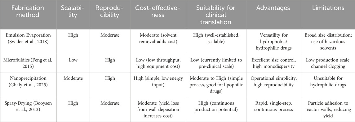 Modern medicine asserts that pathological conditions originate from aberrant cells within bodily organs, and effective therapeutic intervention fundamentally relies on precise delivery of pharmacological agents. To achieve successful localization at diseased cells, these therapeutic compounds must overcome multiple physiological barriers including inadequate solubility, suboptimal membrane permeability, and rapid metabolic degradation. Implementation of advanced drug delivery systems designed for targeted transport to pathological cellular sites can simultaneously enhance therapeutic safety profiles, improve clinical efficacy, and mitigate intrinsic pharmaceutical limitations such as systemic toxicity, compromised hydrophilicity, molecular instability, and insufficient tissue specificity. Medical nanotechnology innovations have significantly advanced the engineering of nanoscale therapeutic delivery platforms. The polymer PLGA, certified by the FDA for its biodegradability, has become a cornerstone material in fabricating these precision-targeted nanocarriers, enabling enhanced pharmacological agent localization and temporally regulated payload release. At present, PLGA nanoparticles carrying various hydrophilic and hydrophobic drugs are being studied to solve various thorny diseases. In addition, many studies are exploring various synthesis techniques to improve the targeting ability of PLGA nanoparticles and enable them to be highly specific in transporting to target organs (Matoba and Egashira, 2014). The preparation method of PLGA nanoparticles may affect their physical and chemical properties, such as particle size, particle shape, particle size distribution, suspension stability, and drug encapsulation efficiency (Allahyari and Mohit, 2015). The methods for preparing PLGA nanoparticles include the following: (1) Emulsion evaporation method, which is the most commonly used method, divided into single emulsion method and double/multiple emulsion method. The single emulsion method begins by solubilizing PLGA and hydrophobic drugs in organic media (e.g., chloroform). This organic phase is subsequently combined with a surfactant-stabilized aqueous solution (typically containing polyvinyl alcohol) to generate an oil-in-water dispersion. Mechanical homogenization or ultrasonic energy is then applied to achieve nanoemulsion formation. PLGA nanoparticles can be obtained through centrifugation, washing, and freeze-drying (Mir et al., 2017; Swider et al., 2018). The double/multiple emulsion approach initiates by incorporating an aqueous suspension of hydrophilic therapeutic agents into a PLGA-containing matrix, creating a primary water-in-oil dispersion. This intermediate emulsion is subsequently dispersed into a secondary surfactant-rich aqueous medium, establishing a stabilized multi-compartmental emulsion system. Through precisely controlled solvent elimination, structurally consolidated nanoparticles are obtained. This versatile methodology enables simultaneous encapsulation of both lipophilic and hydrophilic pharmaceutical compounds. Furthermore, colloidal stabilization and dimensional characteristics can be modulated by optimizing mechanical agitation parameters such as rotational velocity and energy input during the emulsification process (Rezvantalab et al., 2018). (2) Microfluid method, microfluidic systems represent an emerging approach for precise control of minute fluid quantities. This methodology operates on the fundamental concept where two immiscible fluids converge within micron-sized channels. Through the application of external forces or hydrodynamic shear stress, these fluids fragment into nanoscale emulsion droplets. Subsequent solvent evaporation induces particle solidification, ultimately yielding uniform nanoparticles. The advantages of microfluidic methods are uniform particle size distribution, high repeatability, and easy surface modification. Its limitation is that the production scale is small and microchannels are prone to blockage (Sun et al., 2014; Feng et al., 2015). (3) Nanoprecipitation method, PLGA polymers and hydrophobic therapeutic agents demonstrate mutual solubility in water-miscible organic solvents. The resultant homogeneous organic phase undergoes controlled-rate infusion into a surfactant-stabilized aqueous phase via precision syringe pumping. Subsequent rapid solvent diffusion initiates interfacial phase separation, driving the spontaneous self-assembly of PLGA-drug complexes into monodisperse nanoparticles. This nanoprecipitation methodology exhibits exceptional reproducibility and operational simplicity, while its inherent hydrophobicity-driven assembly mechanism inherently limits encapsulation efficacy for hydrophilic pharmaceutical compounds (Ghaly et al., 2025; Long et al., 2025). (4) Spray-drying method, hydrophilic drug-loaded aqueous phases can be homogenized with PLGA-containing organic phases under high-shear conditions to generate stable water-in-oil emulsions, which may subsequently be engineered into complex multiple emulsion architectures. Particulate matrices are obtained through subsequent implementation of thermally assisted aerodynamic atomization, where controlled pneumatic dispersion of the emulsion systems is coupled with rapid solvent evaporation under optimized thermal conditions (Booysen et al., 2013). Despite its demonstrated versatility in hydrophobic drug encapsulation, spray-drying techniques exhibit critical operational constraints primarily stemming from wall deposition phenomena. Particulate adhesion to internal reactor surfaces during the aerodynamic atomization process substantially compromises production yields, necessitating systematic process parameter optimization to mitigate interfacial interactions between nascent nanoparticles and containment substrates (Ding and Zhu, 2018). A critical comparison of PLGA nanoparticle fabrication techniques, focusing on scalability, reproducibility, cost, and clinical suitabi