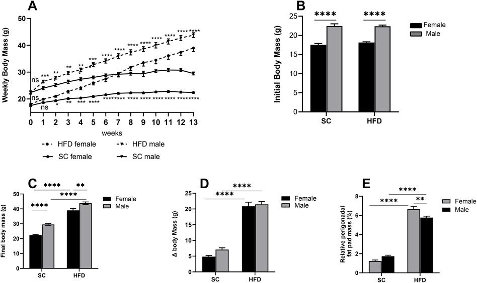 Figure 1. Obesity Model: parameters measured in male and female C57Bl/6 mice fed a SC or HFD diet for 13 weeks. Weekly body mass (A), initial body mass at week 0 (B), final mass at week 13 (C), body mass at week 13 minus mass at week 0 (Δ body mass) (D) and relative perigonadal fat pad mass (%) (E). The values presented are expressed as Mean ± SEM for 12 animals in the SC group and 16 animals in the HFD group. By the data distribution, tests for outlier exclusion were performed using the ROUT test with a Q-value of 1%. Subsequently, a two-way ANOVA followed by Tukey’s post-hoc test. The differences are visually represented as follows: *p < 0.05; **p < 0.01; ***p < 0.001; ****p < 0.0001.