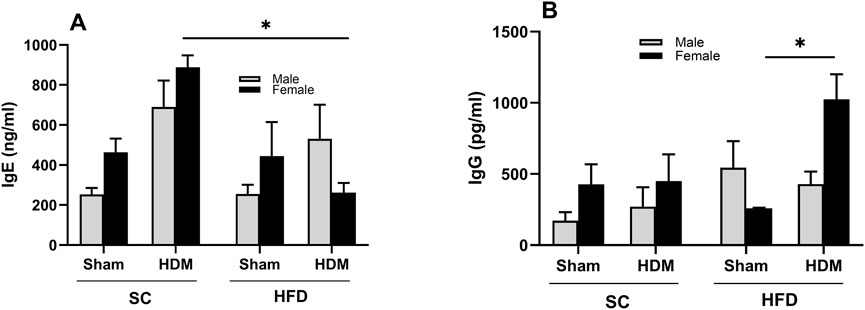 Allergy to HDM is associated with IgE production (Posa et al., 2017). However, adult onset of obese asthma has been marked by lower IgE levels and infrequent antigen-specific IgE antibody detection (Scott et al., 2016). To evaluate whether this is the case in our model, we analysed the levels of total Th2-related antibody IgE in plasma collected from all groups (Figure 6A). We found increased levels of total IgE in SC mice after HDM challenge, irrespective of sex or weight. However, we did not observe the same increase in HFD/HDM female mice and noted a highly variable response in HFD/HDM male mice (Figure 6A). Analysis of the level of total IgG showed a robust increase in HFD/HDM female mice in comparison to HFD/Sham animals (Figure 6B).