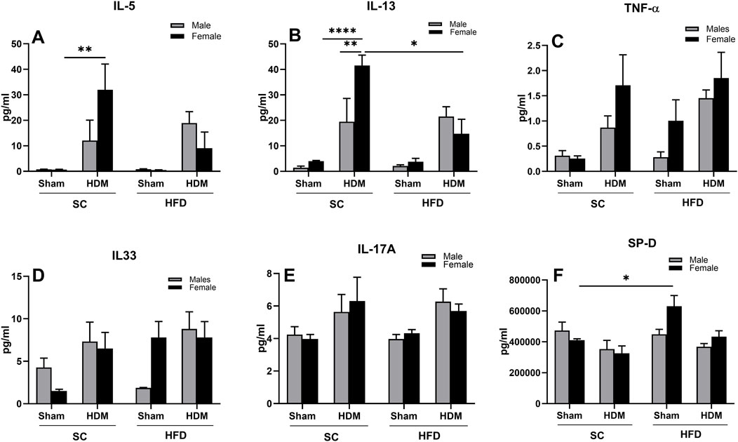 Figure 7. Levels of IL-5 (A), IL-13 (B), TNF-α (C), IL-33 (D), IL-17A (E) and SP-D (F) in male and female C57Bl/6 mice fed for 13 weeks with SC or HFD diet. The values presented are expressed as Mean ± SEM. In accordance with the data distribution, tests for outlier exclusion were performed using the ROUT test with a Q-value of 1%. Subsequently, a three-way ANOVA followed by the Tukey post-hoc test. N = 5/group. The differences are visually represented as follows: *p < 0.01, **p < 0.001.