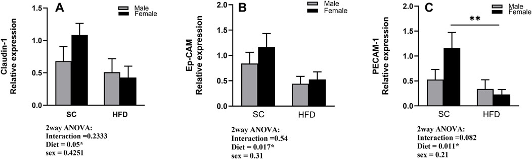 Figure 8. Fold change in gene expression of Claudin-1 (A), Ep-CAM (B), and PECAM-1 (C) in the lungs of sham male and female C57Bl/6 mice fed for 13 weeks with SC or HFD. Data were normalised to 18S rRNA and expressed relative to the sham group and are presented as Mean ± SEM. Outliers were identified using the ROUT test with a Q-value of 1%. Statistical analysis was performed using two-way ANOVA followed by Tukey’s post-hoc test. N = 5 for SC groups and N = 8 for HFD groups. Significant differences are indicated as **p < 0 0.01.