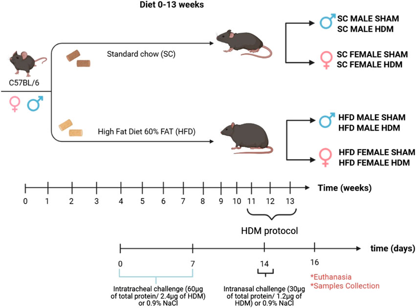 Methods: Male and female C57Bl/6 mice were maintained on a 60% high-fat diet (HFD) or a standard chow diet (SC) for 13 weeks, and on week 11, they underwent an experimental allergic lung inflammation protocol induced by HDM.