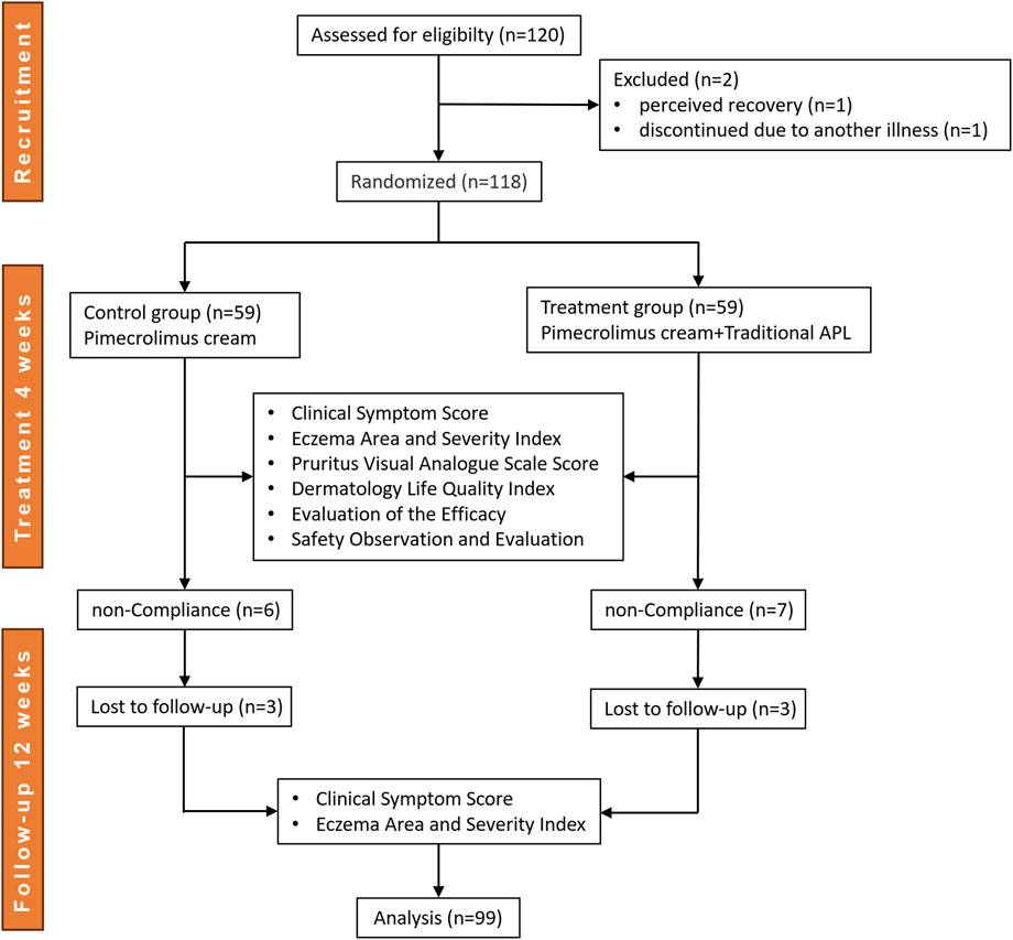 This randomized, controlled trial was conducted between October 2019 and March 2022, during which a total of 120 patients with perianal eczema were recruited from the China-Japan Friendship Hospital (Beijing, China), the Affiliated Hospital of Xuzhou Medical University (Jiangsu, China), and Jinan Central Hospital of Shandong Province (Shandong, China). Random sequences were generated using SPSS 22.0 software based on the random number table method. Eligible participants were assigned to either the treatment group (APL with pimecrolimus cream) or the control group (pimecrolimus cream alone) in a 1:1 allocation ratio. Of the initial participants, 21 patients dropped out of the study, resulting in 99 patients who completed the trial. Data from the treatment group (n = 49) and the control group (n = 50) were included in the final analysis. The enrollment process is outlined in Figure 1.