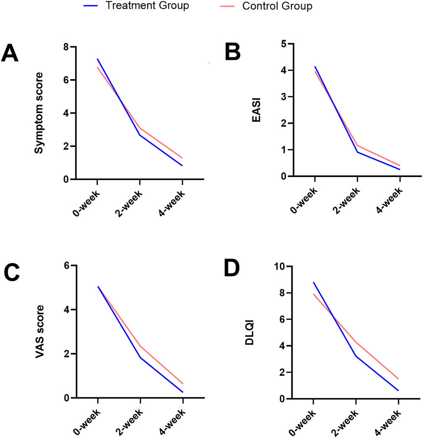 Figure 2. Trends over time in the clinical symptom score (A), EASI (B), pruritus VAS score (C), and DLQI (D) for both the treatment and the control groups.