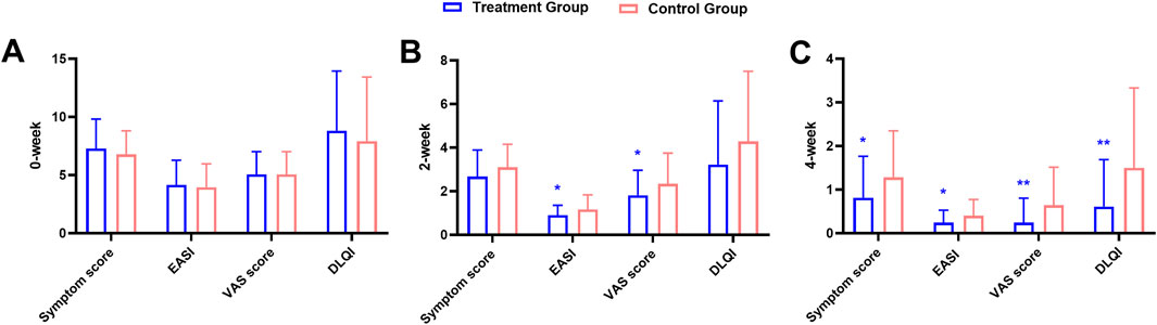 Figure 3. Comparison of clinical indicators at baseline (A), 2-week (B), and 4-week (C) between the treatment and the control groups during the treatment course.