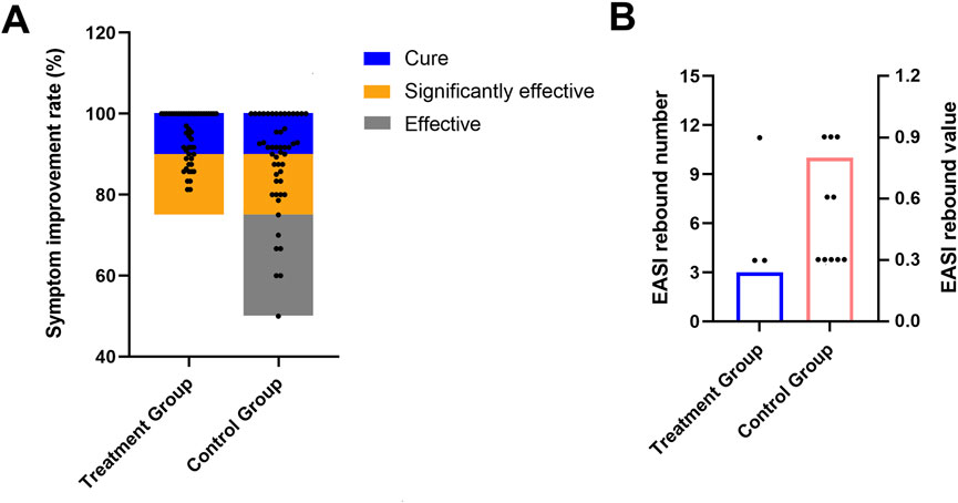 Figure 4. Total significant efficacy of both groups after a 4-week treatment course (A); occurrences of EASI rebound during a 12-week follow-up (B).