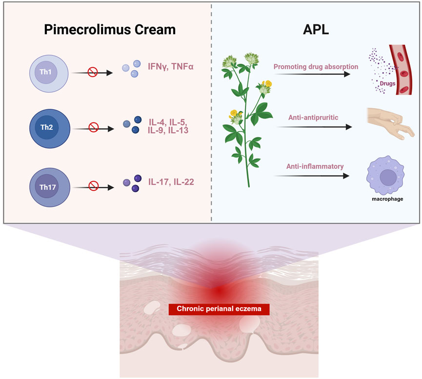 Pimecrolimus cream, a selective topical calcineurin inhibitor, exerts anti-inflammatory effects by suppressing T-cell activation and reducing the production of proinflammatory cytokines such as IL-2, IL-4, and TNF-α. In addition, it modulates neuroimmune interactions by blocking the release of neuropeptides closely associated with pruritus in chronic eczema, such as substance P (Cui et al., 2021; Hua et al., 2022). Furthermore, APL, comprised of traditional Chinese botanical drugs known for their anti-inflammatory, antipruritic, antibacterial, and tissue-regenerating properties, can enhance the overall therapeutic response. In particular, the fumigation and sitz-bath process increases local blood flow and facilitates drug absorption through the skin’s sweat glands and follicles, thereby synergistically boosting the transdermal effects of pimecrolimus.