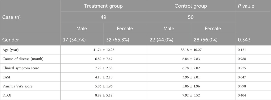 A total of 99 patients who met the inclusion criteria and completed the study were analyzed, consisting of 49 in the treatment group (APL with pimecrolimus cream) and 50 in the control group (pimecrolimus cream alone). No significant differences were observed between the two groups in sex distribution, age, or disease duration (P > 0.05). Baseline clinical indices, including symptom scores, eczema area and severity index (EASI), pruritus visual analogue scale (VAS), and dermatology life quality index (DLQI), did not reveal significant differences between groups before treatment (P > 0.05). All baseline characteristics are comparable for both groups of patients with chronic perianal eczema (CPE), and detailed information is shown in Table 2.