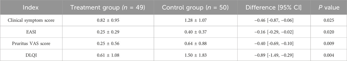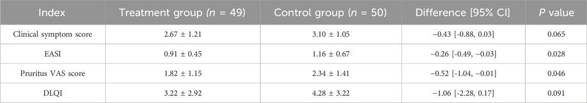 At baseline, there were no significant differences between the two groups for any of these indicators (Figure 3A; Table 2). After 2 weeks of treatment, all four indicators decreased, among which the EASI (treatment group 0.91 ± 0.45 vs. control group 1.16 ± 0.67, P = 0.028) and the pruritus VAS scores (treatment group 1.82 ± 1.15 vs. control group 2.34 ± 1.41, P = 0.046) were significantly different between the two groups (Figure 3B; Table 3). After 4 weeks of treatment, the treatment group showed both statistically and clinically significant improvements across all clinical indicators compared with the control group (P < 0.05). In detail, the clinical symptom scores reduced to 0.82 ± 0.95 in the treatment group, compared to 1.28 ± 1.07 in the control group; the EASI declined to 0.25 ± 0.29 in the treatment group versus 0.40 ± 0.37 in the control group; the pruritus VAS scores decreased to 0.25 ± 0.56 and 0.64 ± 0.88, and the DLQI dropped to 0.61 ± 1.08 and 1.50 ± 1.83, respectively (Figure 3C; Table 4).