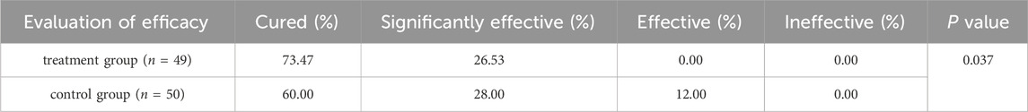 Total significant efficacy was calculated to comprehensively evaluate the overall therapeutic effectiveness of treatment. It represents the proportion of patients who achieved either complete recovery or significant improvement post-therapy. The calculation formula is as follows: Total significant efficacy (%) = (number of clinically cured patients + number of significantly effective patients)/total number of effective patients *100%.