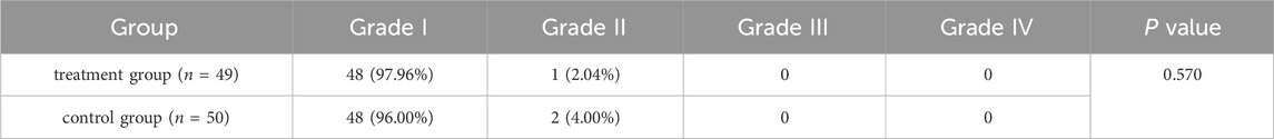 After the initial application of medications, a few patients reported a mild burning sensation around the anal area, lasting from 2 to 30 min and resolving spontaneously. Generally, no local discomfort was experienced after 1–2 days of treatment. No drug-related serious adverse events were observed in either group, and patients demonstrated good tolerance in the local anal area, with no severe allergic reactions or significant side effects. In detail, 97.96% of patients (48 cases) in the treatment group were classified as Grade I, while 2.04% (1 case) were classified as Grade II. In the control group, 96.00% (48 cases) were classified as Grade I, while 4.00% (2 cases) were classified as Grade II. No patients in either group experienced Grade III or Grade IV adverse reactions (Table 6). Overall, the treatments were safe and well-tolerated, with no severe adverse reactions observed in either group.