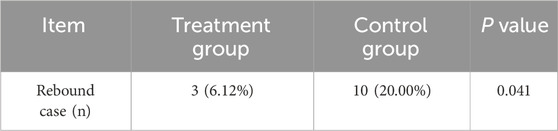 After the 4-week treatment, both groups discontinued therapy and were followed up for 3 months (12 weeks). During this follow-up period, clinical symptoms were recorded, and the EASI was recalculated. In the treatment group, 3 out of 49 cases (6.12%) experienced a return or worsening of symptoms, with an EASI rebound, compared to 10 out of 50 cases (20.00%) in the control group (χ2 = 4.178, P = 0.041) (Figure 4B; Table 7). These findings indicate that pimecrolimus cream combined with APL may potentially lower the relapse rates of CPE, suggesting a possible clinical advantage in maintaining symptom remission.