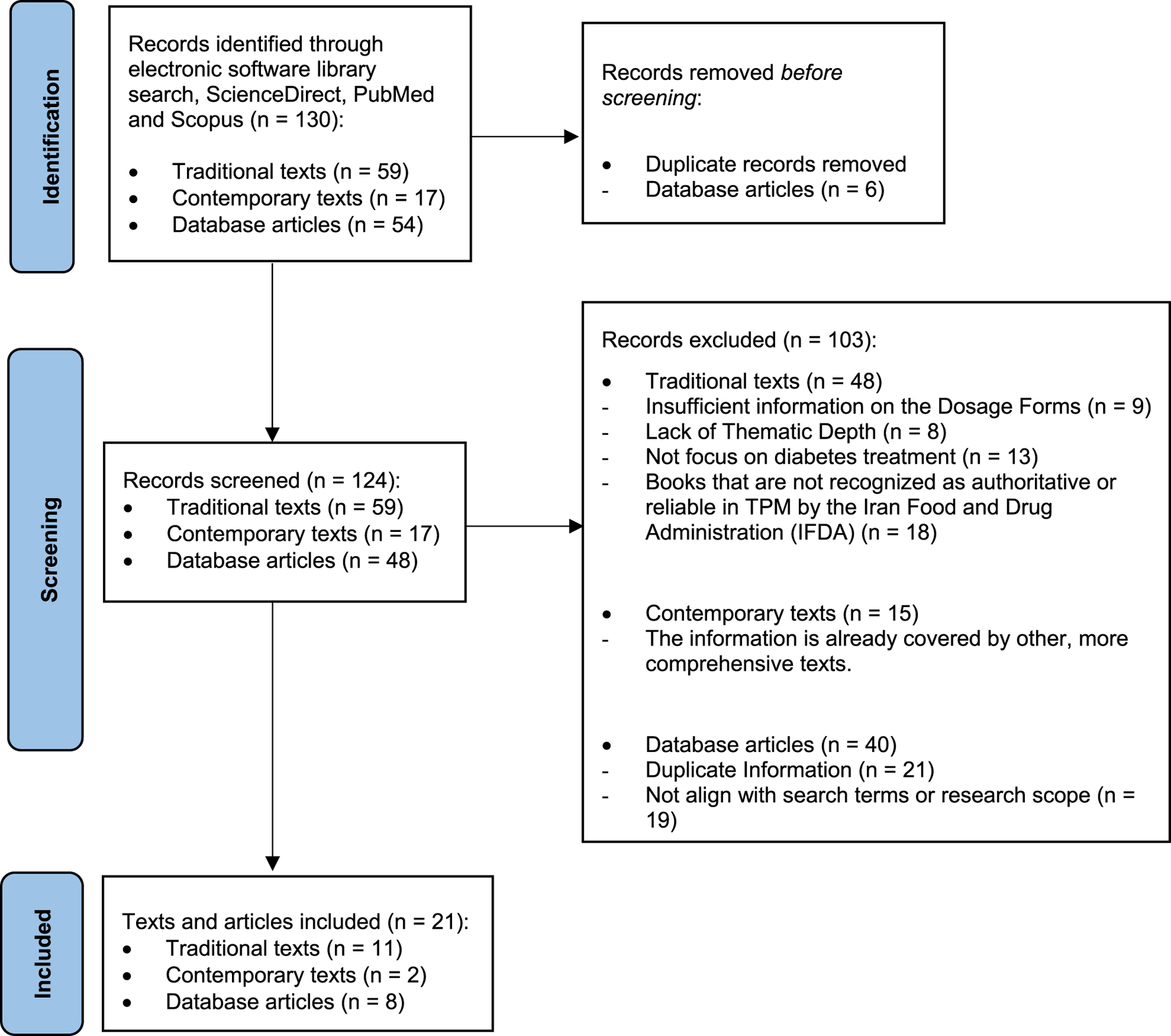 This review was conducted in three distinct phases. The first phase, historical text mining, involved a targeted search of authoritative sources among surviving Persian manuscripts dating from the 9th to the 18th centuries. Traditional knowledge was systematically extracted using Noor software (version 1.5), a searchable digital library comprising approximately one thousand TPM texts. Sources exhibiting low thematic relevance or superficial similarity were excluded using a modified PRISMA methodology (Figure 1). Following this process, 11 traditional texts were selected based on rigorous screening and final evaluation of thematic relevance. These books, endorsed by the Iran Food and Drug Administration, are supported by empirical evidence, possess historical validity, and are grounded in the philosophical principles that form the foundation of TPM. These books include Al-Hawi (1) (Razi, 2005), Al-Qanun fi al-tibb (2) (Avicenna, 2005), Al-Aghraz Al-Tabiyeh (3) (Jorjani, 2010), Tohfato Al'-Momenin (4) (Tonekaboni, 2007), Qarabadin-e-Kabir (5) (Aghili Alavi Khorasani Shirazi, 2007), Makhzan-Al’ Advieh (6) (Aghili Alavi Khorasani Shirazi, 2008), Makhazen al Taalim (7) (Khan, 2015), Kamil al-Sana’ah al-Tibbiyya (8) (Ahwazi, 2009), Exir-e-Azam (9) (Chashti and Nazem, 2008), Qarabadin-e-Aazam (10) (Chashti and Nazem, 2004), and Tebe-Akbari (11) (Arzani, 2009). The review focused on identifying content related to diabetes by using search terms such as “Dhiabitos,” “Dulāb,” and other relevant names listed in Section 3.1. Relevant material was systematically extracted, including definitions of diabetes according to conventional medical frameworks, clinical signs and symptoms, the two types of diabetes as classified in TPM, along with their distinguishing features and corresponding treatments, dosage forms previously prescribed for each type, and principles guiding the formulation of compound medicines, along with supplementary information. Additionally, all herbal and mineral constituents referenced in these dosage forms were documented. For each medicinal plant cited, data were recorded on traditional name(s), plant part(s) used, and temperament classification.