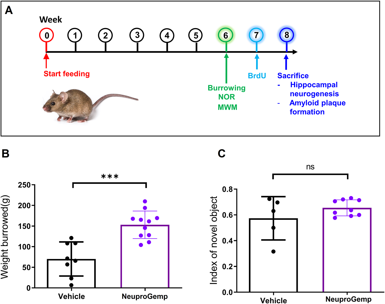 Effects of NeuproGemp on burrowing behavior and novel object recognition in APP/PS1 mice. (A) Experimental timeline: 5-month-old APP/PS1 transgenic mice were orally administered either vehicle or NeuproGemp (300 mg/kg/day) for 6 weeks. Burrowing and novel object recognition (NOR) tasks were conducted during the 6th week of treatment. (B) Burrowing task: Total amount of pellets displaced over a 2-h period. APP/PS1 mice treated with vehicle (n = 8) or NeuproGemp (n = 11) are shown. (C) Novel object recognition task: Discrimination index calculated as (time spent with novel object–time spent with familiar object)/total exploration time. Data are presented as mean ± SD. Statistical analysis was performed using unpaired two-tailed t-tests, with significance indicated as ***, p < 0.001. All behavioral tests were conducted under standardized lighting and noise conditions, and mice were habituated to the testing room for at least 30 min prior to assessment.