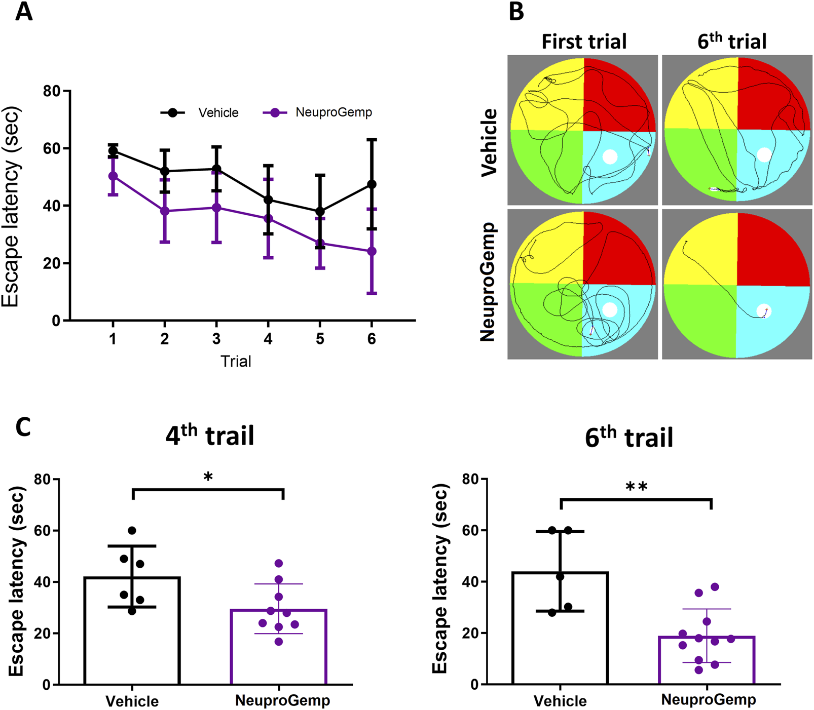Spatial learning and memory of APP/PS1 transgenic mice were evaluated using the Morris water maze (MWM) after 6 weeks of oral NeuproGemp administration (300 mg/kg/day). The test was conducted from day 49–64, based on a modified protocol from (Tzeng et al., 2018). The apparatus consisted of a circular pool (120 cm diameter, 40 cm height) filled with opaque water at 25 °C ± 1 °C to a depth of 20 cm. A hidden platform (10 cm diameter) was submerged 1 cm below the surface in one quadrant, which remained constant throughout testing. Mice underwent six trials per day for six consecutive days. Each trial lasted up to 60 s; if the platform was found, the mouse remained on it for 30 s. If not, it was guided to the platform and allowed to stay for the same duration. Inter-trial intervals were set at 60 s. Escape latency (time to reach the platform) was recorded. Representative swim paths were documented on the first and sixth trials. On day 4 and 6, NeuproGemp-treated mice (n = 12) showed significantly reduced escape latencies compared to the vehicle group (n = 6), indicating enhanced spatial learning.