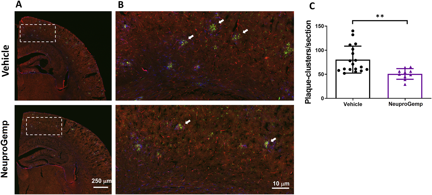 To investigate the impact of NeuproGemp treatment on glial responses associated with amyloid plaques, we performed immunohistochemical analysis on brain sections from 5-month-old APP/PS1 transgenic mice treated with either vehicle or NeuproGemp (300 mg/kg/day) for 8 weeks. Amyloid plaques were labeled using the AB-10 antibody (red), microglia were identified by Iba-1 (green), and astrocytes by GFAP (blue). Low-magnification images of the parietal cortex (Figure 3A) revealed widespread amyloid deposition in both vehicle- and NeuproGemp-treated mice. However, higher magnification images of the boxed cortical regions (Figure 3B) showed clear differences in glial organization around plaques. In the vehicle-treated group, amyloid plaques were frequently surrounded by dense clusters of activated microglia and reactive astrocytes, as indicated by the co-localization of Iba-1 and GFAP immunoreactivity around plaques (white arrows). These glial clusters were less prevalent in the NeuproGemp-treated group, where the glial responses appeared more diffuse and less tightly associated with plaques. Quantitative analysis (Figure 3C) confirmed that the number of microglial and astroglial clusters associated with plaques was significantly reduced in the NeuproGemp group compared to vehicle controls. On average, vehicle-treated mice exhibited approximately 95 ± 22 clusters per section, while NeuproGemp-treated mice showed a significantly lower number, approximately 55 ± 11 clusters per section (p < 0.01, Student's t test). These data suggest that NeuproGemp treatment attenuates the recruitment or retention of glial cells around amyloid plaques in this Alzheimer’s disease model.
