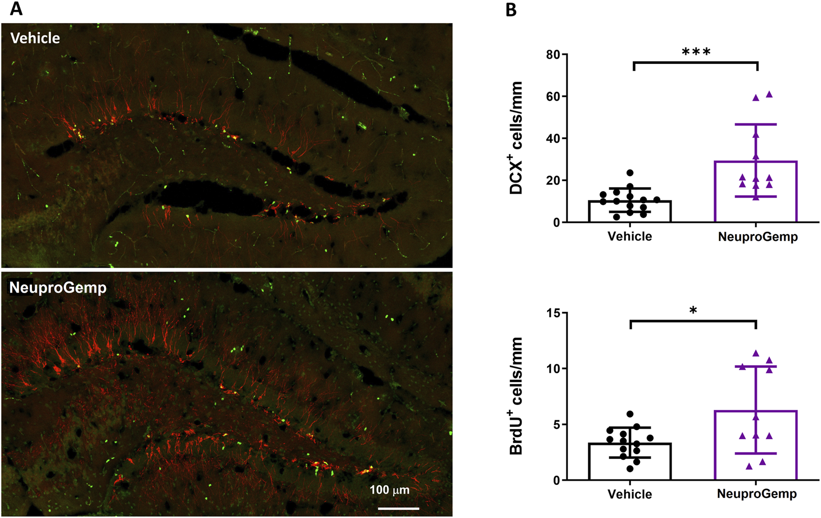 NeuproGemp enhances hippocampal neurogenesis in APP/PS1 mice. 5-month-old APP/PS1 transgenic mice were orally administered vehicle (n = 14) or NeuproGemp (300 mg/kg/day, n = 10) for 8 weeks. Hippocampal neurogenesis was assessed by immunofluorescence staining with doublecortin (DCX, red) for immature neurons and BrdU (green) for proliferating cells. (A) Representative images of the dentate gyrus (DG) area. Scale bar: 100 μm. (B) Quantification of DCX-positive and BrdU-positive cells in the subgranular zone (SGZ) of the DG, expressed as number of positive cells per mm of SGZ. Data are presented as mean ± SD. Statistical significance between Vehicle and NeuproGemp-treated groups was determined using unpaired two-tailed Student’s t-test, with *, p < 0.05; ***, p < 0.001. All staining and imaging were performed under identical conditions, and investigators performing quantification were blinded to treatment groups.