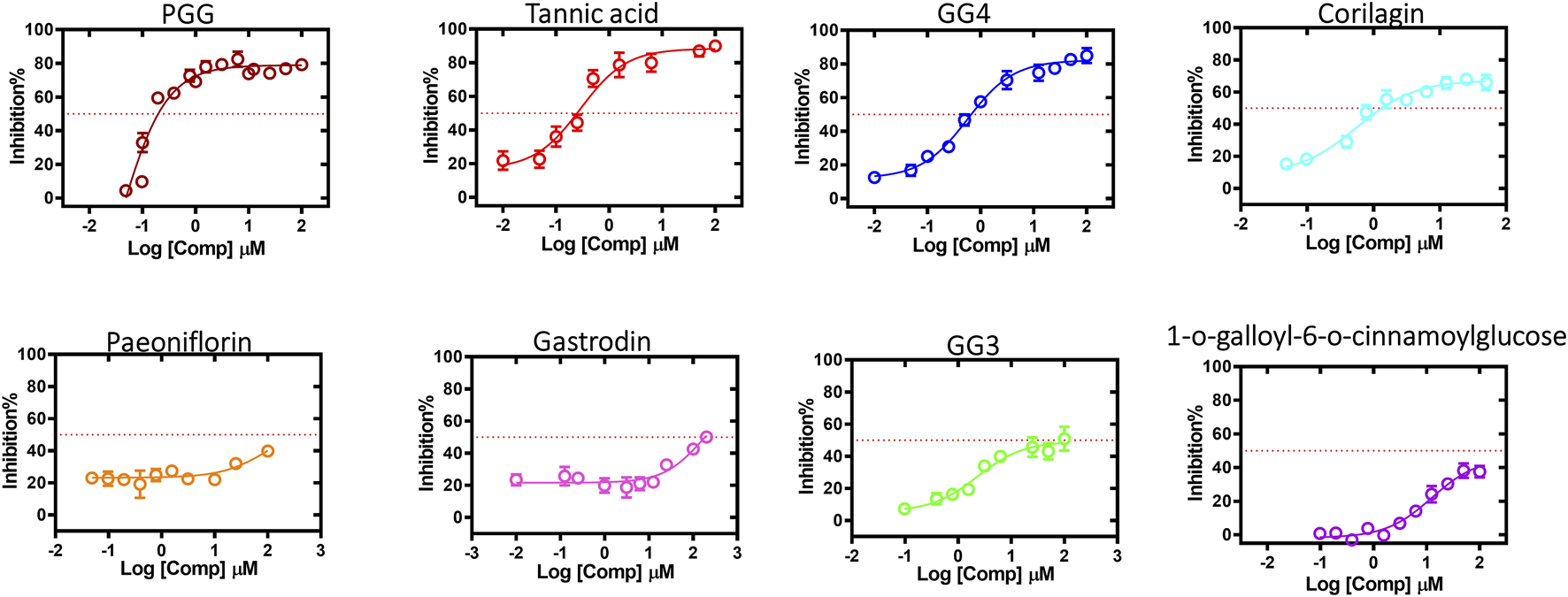 ![Graphs show inhibition percentages versus log concentration (Log[Comp] μM) for seven compounds: PGG, Tannic acid, GG4, Corilagin, Paeoniflorin, Gastrodin, GG3, and 1-o-galloyl-6-o-cinnamoylglucose. Each graph has a distinct color and an upward trend, indicating increased inhibition with higher concentrations, with a red dotted line marking a reference point.](https://www.frontiersin.org/files/Articles/1673532/xml-images/fphar-16-1673532-g008.webp)